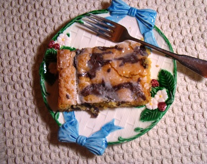 Optional: melt 1/2 -1 cup chocolate chips and swirl over the top of the cake while it is still hot.